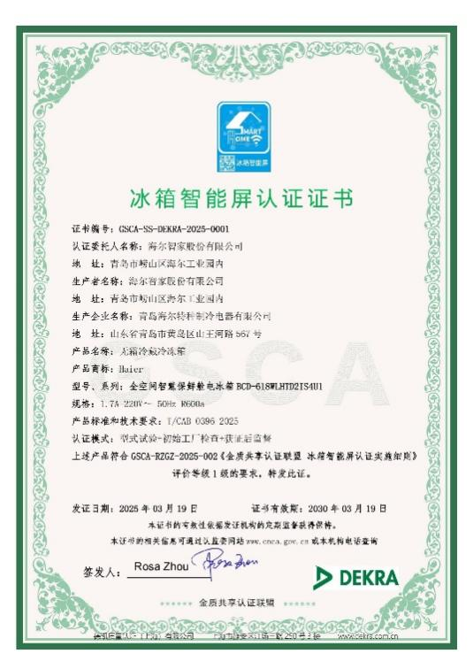 2025年3月20日,在上海新國際博覽中心舉辦的中國家電及消費電子博覽會(AWE)上,中標能效科技聯(lián)合德凱為青島海爾電冰箱有限公司全空間保鮮冰箱頒發(fā)了兩項智能冰箱認證證書。