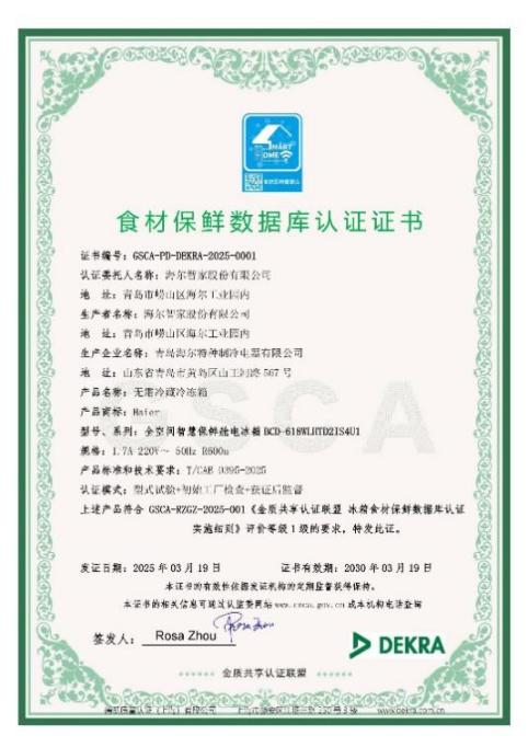 海爾全空間保鮮冰箱BCD-618WLHTD2IS4U1在智能屏應(yīng)用、語音識別、食材保鮮及管理等智能化方面取得了新的突破,通過實驗室的檢測達到了最高等級1級水平,在冰箱智能屏和冰箱食材保鮮數(shù)據(jù)庫領(lǐng)域獲得首張認證證書。
