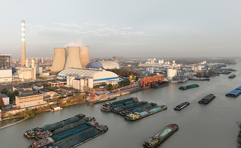11月28日,運輸電煤的船舶經過京杭大運河揚州段(無人機照片)。